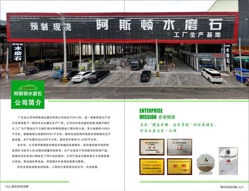 廣東省云浮市阿斯頓水磨石有限公司創(chuàng)辦于2014年,是一家集研發(fā)生產(chǎn)設(shè)計(jì)定制銷售于一體的專業(yè)水磨石生產(chǎn)廠家,公司近年來(lái)迅速的發(fā)展,規(guī)模不斷擴(kuò)大,工廠生產(chǎn)基地位于云城區(qū)格木橋轉(zhuǎn)移基地三期興旺大道,其占地面積12000平方米,旗艦展館占地面積5000 平方米,擁有先進(jìn)的荒料成型及切割拋光生產(chǎn)線設(shè)備,年產(chǎn)水磨石達(dá)200萬(wàn)平方米,現(xiàn)貨常年庫(kù)存15-20萬(wàn)平方米。 \\\