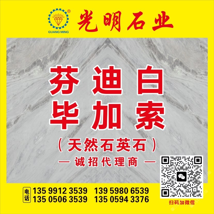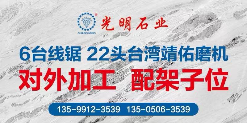 公司主要生產(chǎn)加工國內(nèi)外大理石、花崗巖、工程板、臺板、異形線條及地鋪石系列,目前擁有一系列先進(jìn)生產(chǎn)設(shè)備,具備加工優(yōu)質(zhì)石材的能力,可加工各種規(guī)格平板、弧形及異形板,承包國內(nèi)外多座大理石、花崗巖礦山,荒料庫存達(dá)數(shù)十萬立方,大板庫存量達(dá)幾十萬平方,可承接國內(nèi)外各種大型工程。多年來先后在北京、上海、浙江、天津、廣東、江蘇、湖北、四川、新疆、江西等地設(shè)立分公司,健全了公司的銷售網(wǎng)絡(luò),使光明的品牌深入人心,產(chǎn)品深得廣大顧客的一致好評。良好的信譽也使公司先后榮獲“文明經(jīng)營戶”、“誠信單位”、“明星企業(yè)”、“石材之星”、“全國質(zhì)量信得過產(chǎn)品”、“全國質(zhì)量服務(wù)消費者滿意企業(yè)”、“守合同、重信用單位”的榮譽稱號,并通過了DHSAS18001健康管理體系認(rèn)證、GB/TI9001-2000-ISO9001:2000質(zhì)量標(biāo)準(zhǔn)和ISO14001:2004環(huán)境管理體系認(rèn)證。\\\\\\\\\\\\\\\