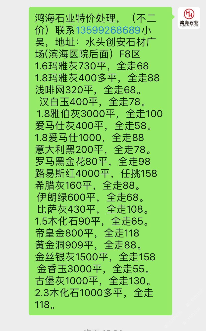 鴻海石業(yè)-現(xiàn)板5萬平特價(jià)處理,(不二價(jià))聯(lián)系13599268689小吳,地址:水頭創(chuàng)安石材廣場(chǎng)(濱海醫(yī)院后面)F8區(qū) 1.8絲綢白3000平,150起 1.8金絲銀灰7500平,100起1.8夢(mèng)幻藍(lán)4500平,100起。1.8卡拉垃白一150元起。 1.8藍(lán)色星球1300平,150起水墨年華6000平全走78。 1.8午夜星河1300平,150起1.8多蘭戈(紅色)300平,柏斯高灰2000平,全走88 新瑪雅灰3500平,全走88 1.5瑪雅灰200多平,全走68 星塵灰400平,全走88。 愛馬仕灰7500平,全走78 羅馬黑金花60平,全走88 黃金洞909平,全走88。 金香玉300平,全走50。 古堡灰1000平,全走99。 云?;?00多平全走128。2.3木化石100平,全走128。