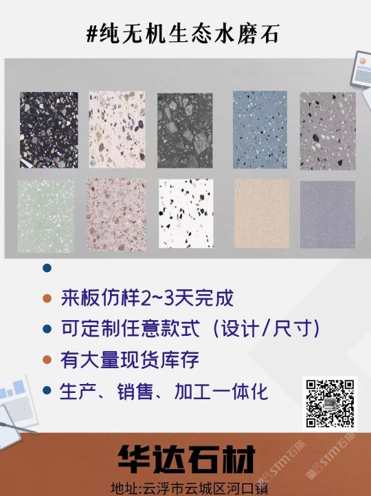 云浮市華達(dá)聚賢新型石材有限公司是一家以研發(fā)制造、加工、銷售新型人造石、天然石及其制品的企業(yè)。公司位于云浮市云安區(qū)石城鎮(zhèn)上洞村,占地面積30000平方米,年可生產(chǎn)人造無(wú)機(jī)石板材、自流平仿石材產(chǎn)品120萬(wàn)平方。公司擁有原材料生產(chǎn)配套基地,保證日常生產(chǎn)所需的石料、石粉,有成品加工生產(chǎn)車間,有直營(yíng)門店銷售,能為客戶提供從原材料選料、打樣定制、生產(chǎn)加工、工程配套等服務(wù)。華達(dá)聚賢新型石材無(wú)機(jī)水磨石、仿石材產(chǎn)品,屬于循環(huán)利用環(huán)保產(chǎn)品,所有原材料都是無(wú)機(jī)類選材,產(chǎn)品美觀實(shí)用,耐污耐磨,防火性能好,無(wú)異味,色彩斑斕,搭配元素多樣,深受國(guó)內(nèi)外設(shè)計(jì)師喜愛(ài),適用于家具、商場(chǎng)、學(xué)校、酒店、地鐵站、政府機(jī)關(guān)、企業(yè)機(jī)構(gòu)等大型公共設(shè)施室內(nèi)外鑲貼,屬新型環(huán)保建材。公司通過(guò)GB/T19001-2016idtISO9001:2015質(zhì)量管理體系認(rèn)證和GB/T24001-2016idtISO14001:2015環(huán)境管理體系認(rèn)證。