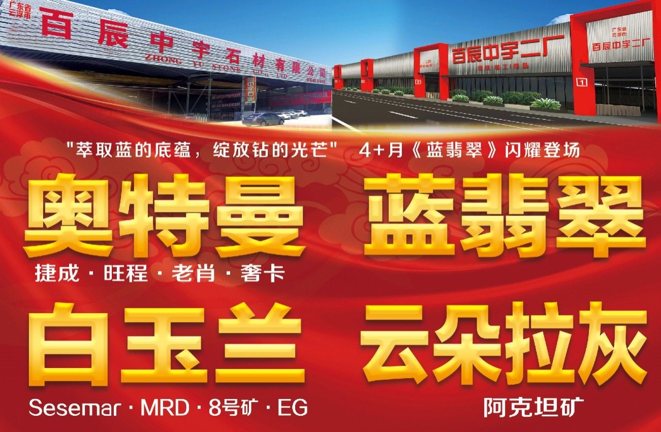 百辰中宇石業(yè)有限公司:源于2010年,至2018年擁有云浮河口工廠、水頭永泉山一廠和水頭福山工業(yè)區(qū)百辰中宇二廠??傆?7臺切機,5臺線鋸,4臺立體烘干線,5臺磨機。年產量可達到160萬平起。