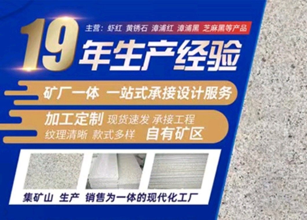 漳浦縣鴻勝石材有限公司是一家集礦山開采、自營加工生產(chǎn)、自主產(chǎn)供銷為一體的石業(yè)公司,公司擁有數(shù)家生產(chǎn)基地、手工加工場、大型礦山。公司創(chuàng)業(yè)歷程10年,憑著豐富的加工生產(chǎn)經(jīng)驗(yàn)、雄厚的技術(shù)力量和先進(jìn)的設(shè)備,產(chǎn)品遠(yuǎn)銷歐美、韓國、新加坡、臺灣等地,深受客戶的信賴與好評。 本公司產(chǎn)品主要有: 漳浦紅,漳浦黑,漳浦青,漳浦蝦紅,漳浦銹石,福建青,安山巖,芝麻黑,芝麻灰,沙漠棕等。