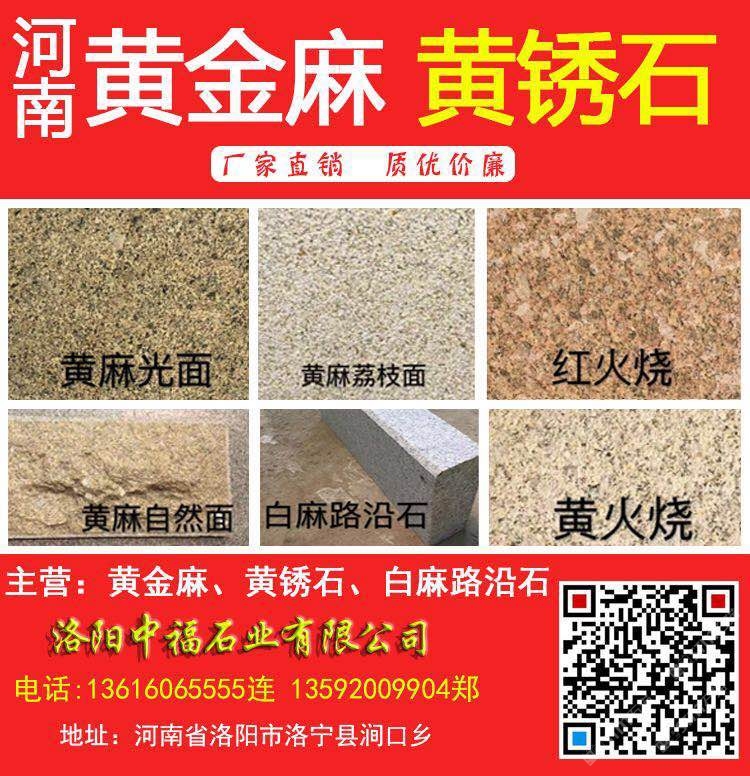 洛陽中福石業(yè)(電話:13616065555連17036286666連13592009904鄭)是河南黃金麻、河南黃銹石、河南白麻、河南芝麻白、角美銹、龍海銹、漳浦銹、g682石材、g682花崗巖、黃金麻花崗巖、黃金麻石材、黃色石材、黃色花崗巖、荒料、路沿石、墓碑石、工程面板、異型加工、芝麻黑廠家、花崗巖石材、幕墻石材、干掛板、馬路牙子、水溝蓋板、花圍樹圍、荔枝面、火燒面、磨光面花崗巖板材等產(chǎn)品專業(yè)生產(chǎn)加工的工廠,擁有完整、科學的質(zhì)量管理體系。洛陽中福石業(yè)有限公司的誠信、實力和產(chǎn)品質(zhì)量獲得業(yè)界的認可。歡迎各界朋友蒞臨參觀、指導和業(yè)務(wù)洽談。河南黃麻光面河南黃麻荔枝面河南紅火燒河南黃麻自然面河南白麻路沿石/道牙石/路緣石/路側(cè)石/鋪路石/路邊石河南黃火燒面河南黃金麻河南黃銹石/河南黃金鉆石材/河南芝麻白/河南白色花崗巖/河南白色石材/河南黃色石材/河南黃色花崗巖
