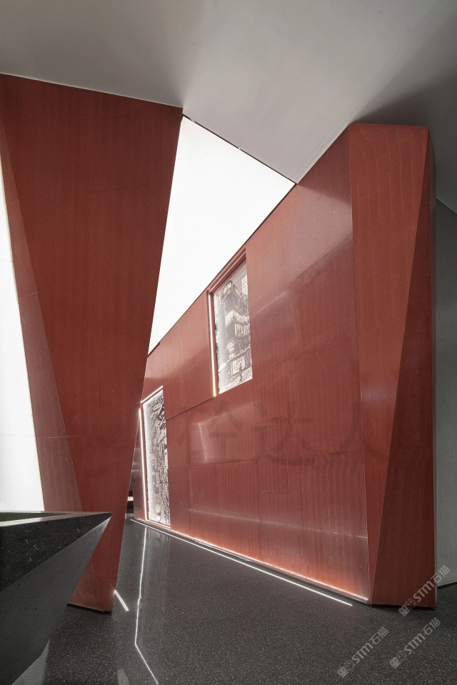 發(fā)布信息: 紅色淺紋洞石運(yùn)用室內(nèi)墻面,異型拼接無(wú)縫處理