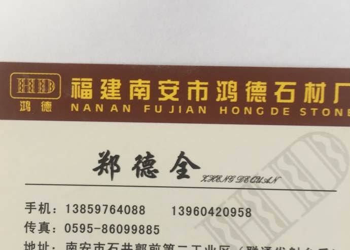 南安市石井鎮(zhèn)郭前村鴻德石材廠 聯(lián)系人:鄭德全    138****4088 查看 138****4088 查看 主營(yíng)范圍: 花崗巖加工、 企業(yè)地址:福建南安石井鎮(zhèn)郭前村鴻德石材廠