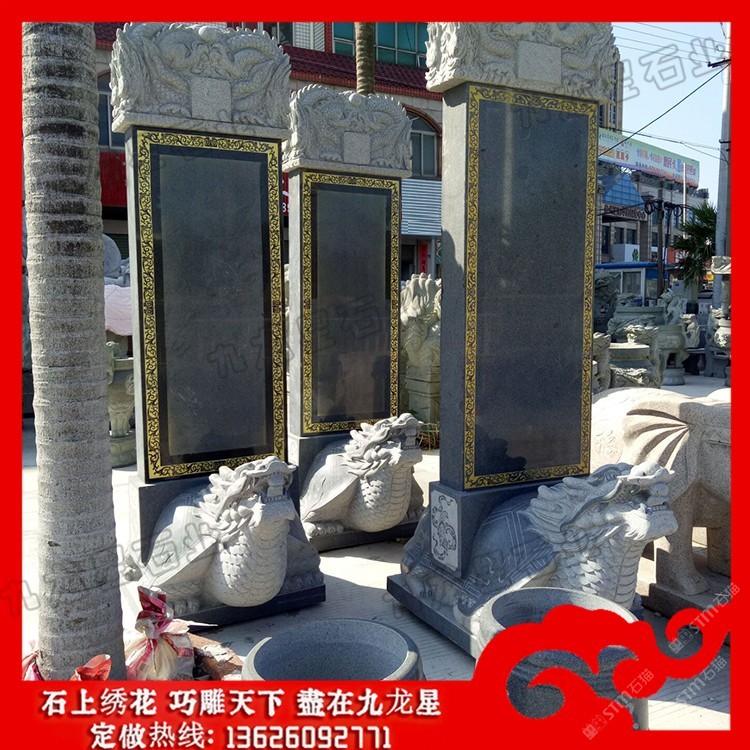 發(fā)布信息: 石雕龜馱碑?dāng)[件 龍龜馱碑圖片價格_九龍星石業(yè)。 石雕龜馱碑?dāng)[件又稱龜載碑、龍龜碑、烏龜碑、龜陀碑等。而確切的說,它應(yīng)該叫赑屃,傳說中它是龍生九子之一,力大無窮而且性格好,又善背重東西。龍龜馱碑多用于寺廟和立碑紀(jì)念,因為龜為長壽的動物,古人以此建碑,也是想保存千秋萬載,讓碑流芳萬古的寄托。 石雕龜馱碑又名霸下,形似龜,傳說為龍九子之一.是老六,螭頭龜足,平生好負(fù)重,力大無窮,碑座下的龜趺是其遺像。傳說霸下上古時代常馱著三山五岳,在江河湖海里興風(fēng)作浪。后來大禹治水時收服了它,并為治水作出了貢獻(xiàn),洪水治服了,大禹擔(dān)心它又到處撒野,便搬來頂天立地的特大石碑,上面刻上霸下治水的功跡,叫它馱著,沉重的石碑壓得它不能隨便行走。