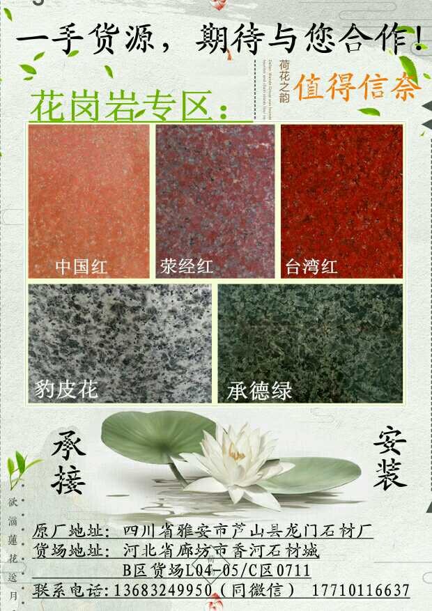 蜀都 聯(lián)系人:武先生    136****9950 查看 177****6637 查看 主營范圍: 環(huán)境石材、石材工藝品、石材外貿(mào)、石材輔料及特殊工藝、石材雕刻、 企業(yè)地址:河北廊坊香河市安平鎮(zhèn)香河石材城B區(qū)花崗巖貨場L04-05~順著一排綠樹走到頭就是
