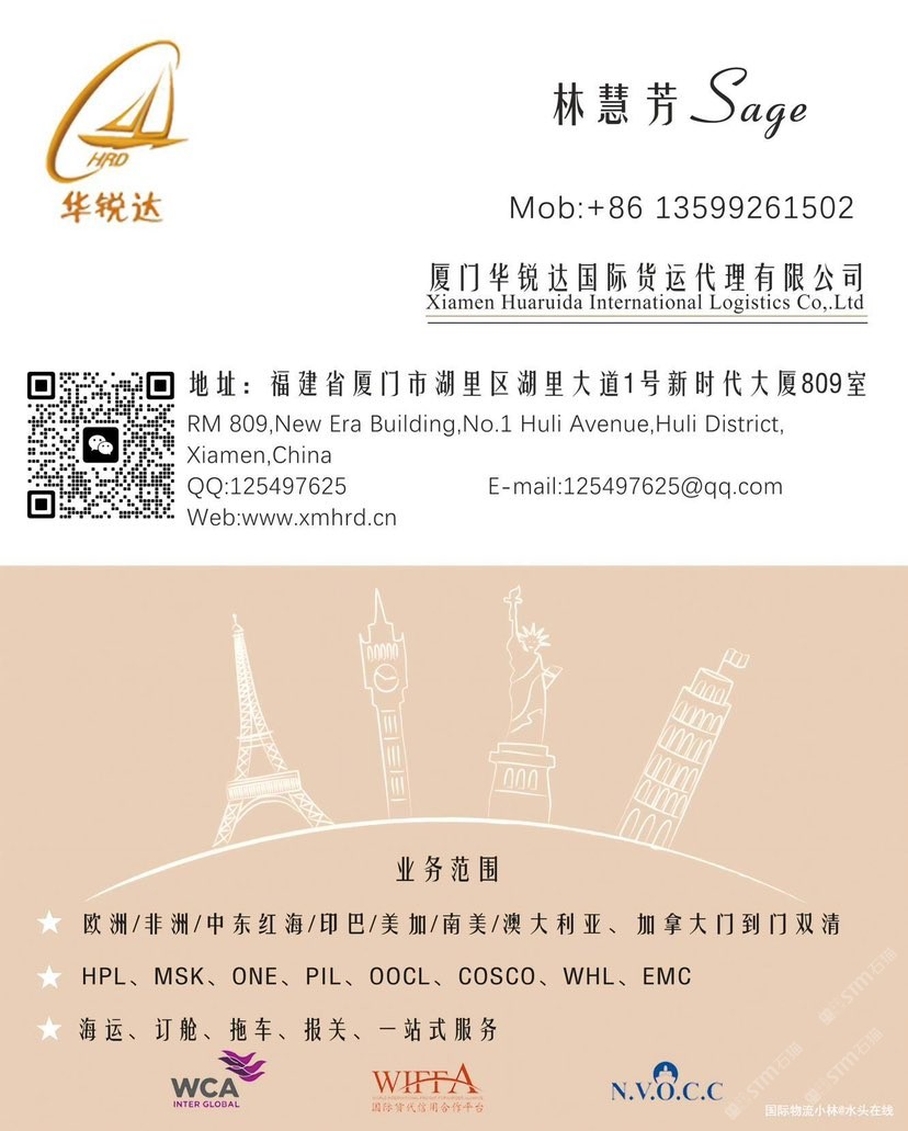 廈門華銳達(dá)國際物流有限公司 聯(lián)系人:林慧芳    135****1502 查看 135****1502 查看 主營范圍: 物流、 企業(yè)地址:福建廈門廈門湖里區(qū)湖里大道1號新時(shí)代大廈8樓809室