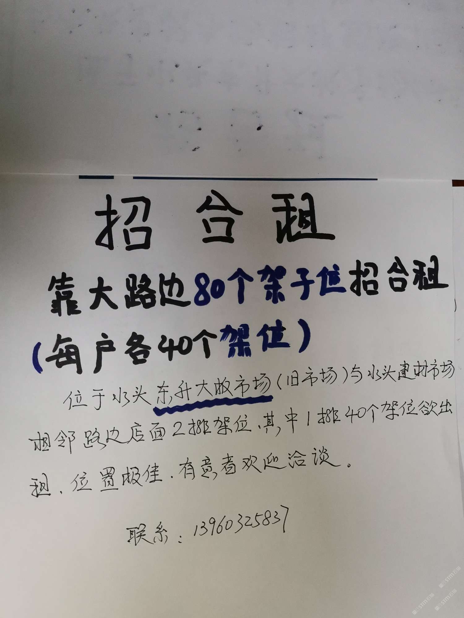 發(fā)布信息: 靠大路邊80個架子位招合租 (每戶各40個架位) 位于水頭東升大板市(舊市場)與水頭建材市場相鄰路邊店面2排架子位,其中一排40個架位欲出租,位置,有意者歡迎洽談 聯(lián)系:13960325837