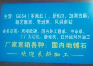 福建省鵬磊石材有限公司主營(yíng)產(chǎn)品:新安哥拉黑,安哥拉黑(黑水晶),黑水晶,啡鉆,粗花654(光面),加多利3,加多利(淺),新金彩麻,海南654(荔枝面),橄欖綠,淺紫點(diǎn)(巴西),紫點(diǎn)金麻(娛樂金麻),紫點(diǎn)金麻(現(xiàn)代金麻)反切面,英國(guó)棕(黑底),山東銹石,山東銹石(荔枝面),加州金麻(黑底),南非紅,黑金沙,黑金沙(中花)企業(yè)地址:福建南安水頭鎮(zhèn)蟠龍工業(yè)區(qū)